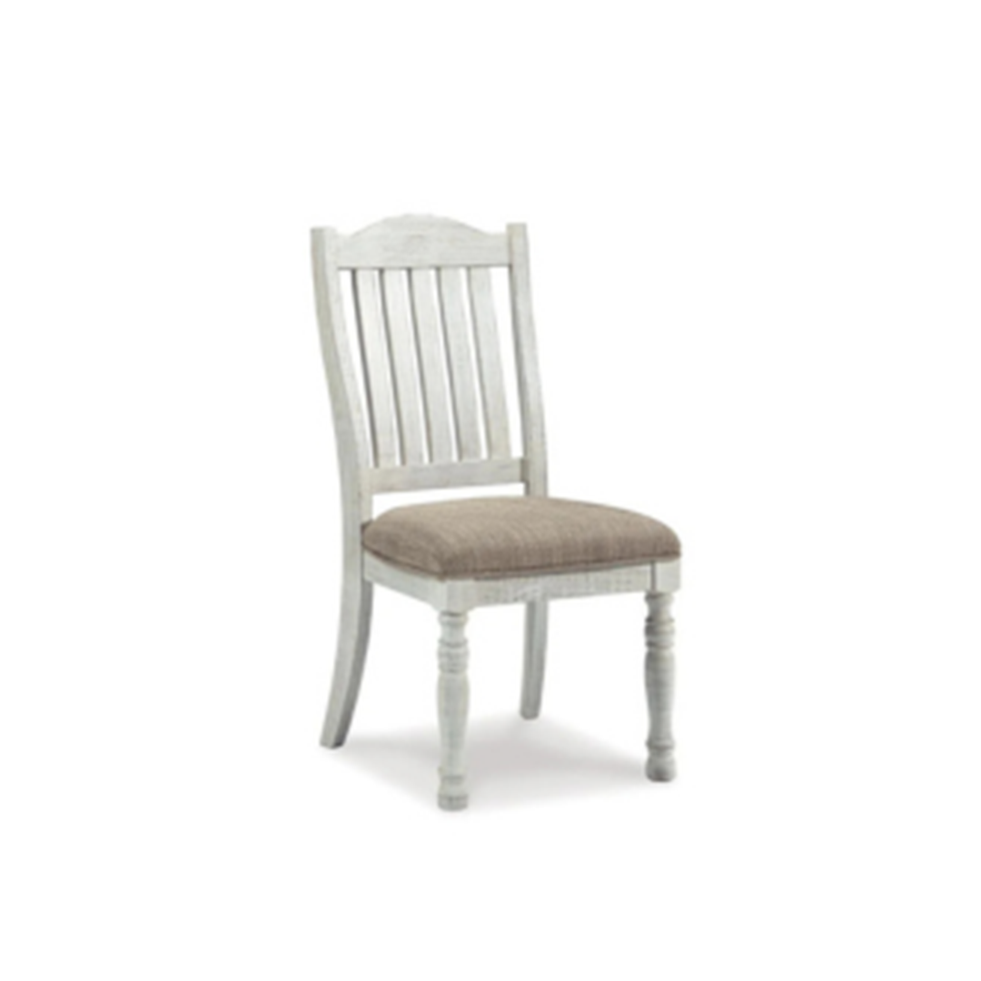 Havalance Döşemeli Yemek Sandalyesi ile modern çiftlik evi tarzının keyfini çıkarın. Eskitilmiş vintage beyaz kaplaması çok çekicidir. Kavisli çıta tasarımı ve yulaf rengi kumaştan döşemeli koltukları güzellik ve konfor katar.