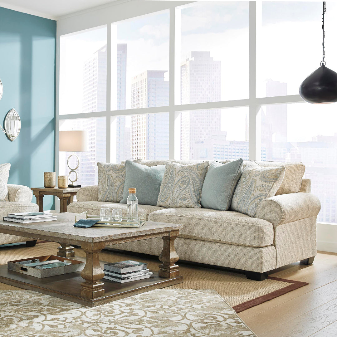 Bu kanepe, klasik ve modern tarz arasında harika bir denge kuruyor. Geleneksel unsurları arasında modern bir zarafet için açılı t-yastık oturma yeri ve geri çekme kolları bulunur. Spa sisi deseni ve jakar desenli lüks yastık koleksiyonu kanepenin gündelik dokulu şönil döşemesini sessiz, yumuşak bir şekilde tamamlıyor. Kumtaşı beji seçimi, nazik ve sevimli bir stil uyanışıdır.