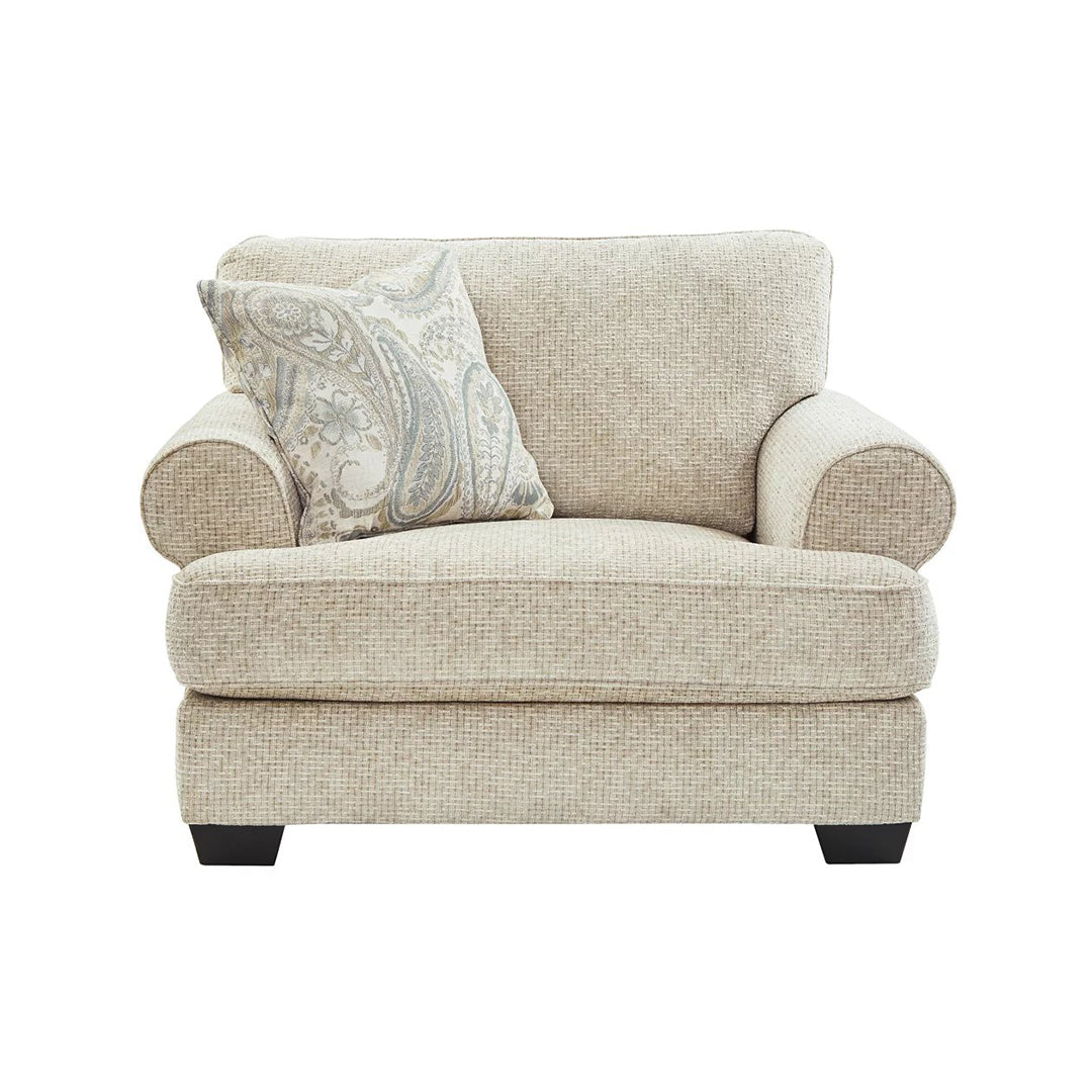 Bu büyük boy berjer, klasik ve modern tarz arasında harika bir denge kuruyor. Geleneksel unsurları arasında modern bir zarafet için açılı t-yastık oturma yeri ve geri çekme kolları bulunur. Jakar desenli yastık, berjerin gündelik dokulu şönil döşemesini sessiz, yumuşak bir şekilde tamamlıyor. Kumtaşı beji seçimi, nazik ve sevimli bir stil uyanışıdır.