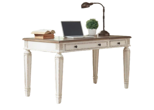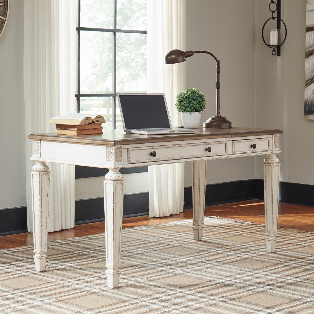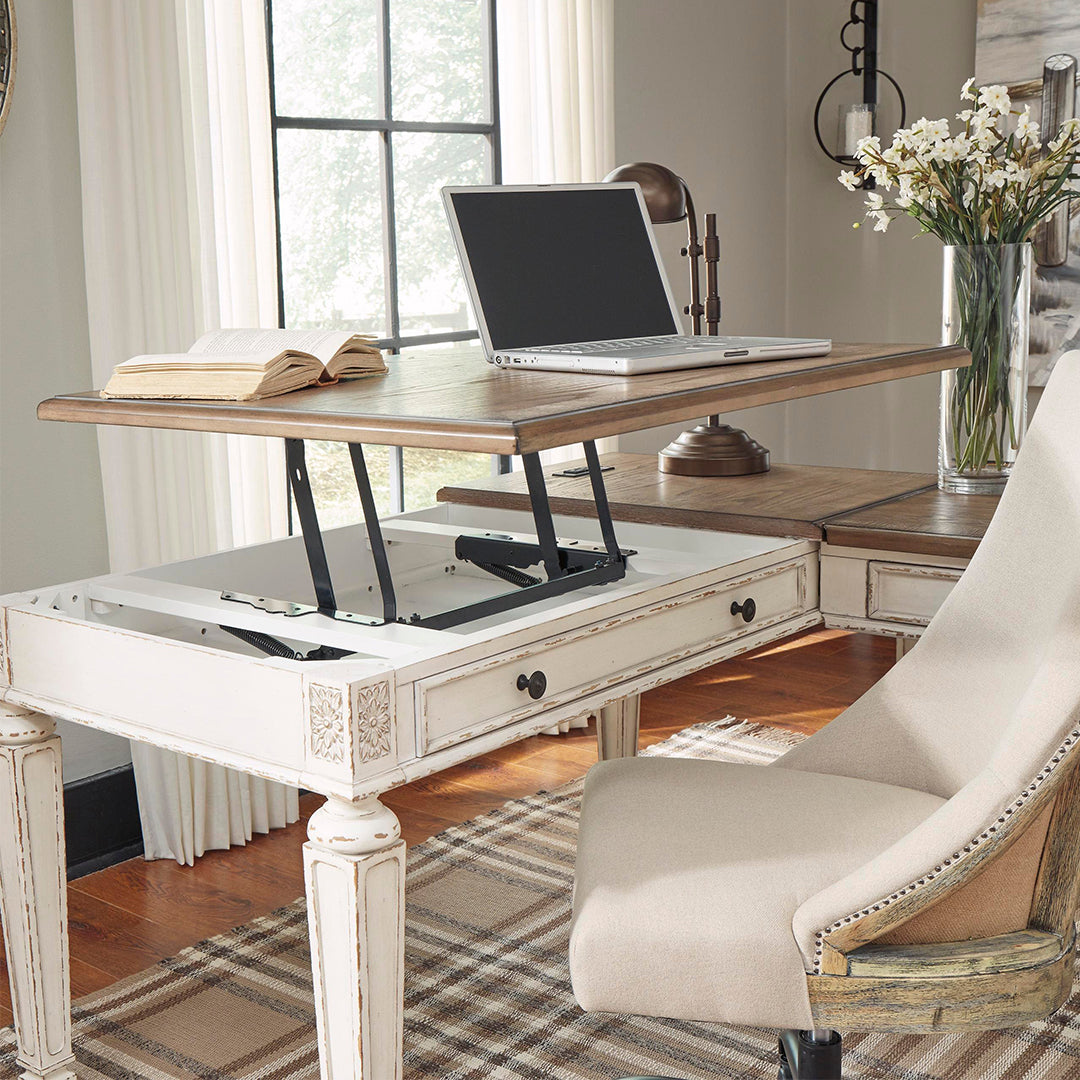 Geleneksel kır evi tarzı sanatını bir üst seviyeye taşıyan bu masayı, gerçekleşmiş muhteşem ev ofisinizdir. Eskitilmiş iki tonlu estetik, daha fazla çekicilik sağlamak için kırpılmış beyaz eskitilmiş ahşap tonlu üst kısımlarla harmanlanıyor. Çerçeveli çekmecenin ön yüzeyleri, dekoratif ve zarif bir şekilde işlenmiş ve konik ayaklar zarafet katlarken, koyu bronz tonlu toplara klasik bir dokunuş katıyor. Yaylı kaldırma üst kısmı, sağlıklı bir alternatif için yüzey rahat bir ayakta durma pozisyonuna yükseltir. Görünüm ve üretkenlik için sürekli olarak güç kaynağı ve çift USB bağlantı noktası, cihazların elinizde bulundurulmasını ve hazır bulundurulmasını sağlar.