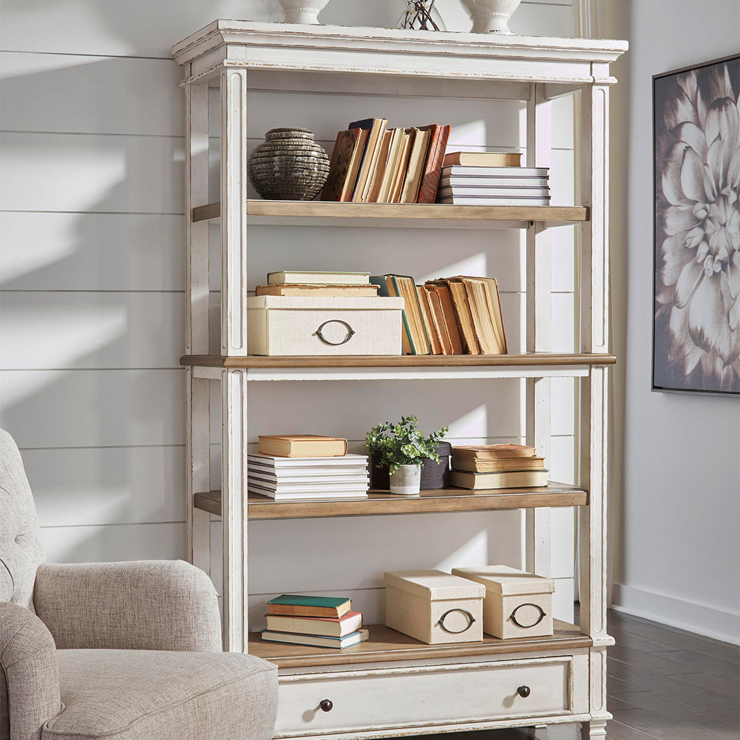 Geleneksel kır evi stili sanatını bir üst seviyeye taşıyan bu kitaplık, gerçekleşmiş muhteşem ev ofisinizdir. Eskitilmiş iki tonlu estetik, daha fazla çekicilik sağlamak için kırpılmış beyazı eskitilmiş ahşap tonlu üst kısımla harmanlıyor. Raf ve çekmece alanı arasındaki akıllı denge harika bir şekilde çalışıyor.