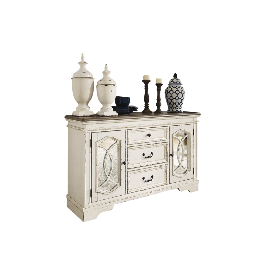 Bu yemek odası sunucusuyla Fransız kırlarından ilham alan göz ziyafeti sunun. Benzersiz unsurlar arasında, aynalı cam üzerine dekoratif oyma işçiliğiyle güzelleştirilen dolap saklama alanı ve yıpranmış beyazı eskitilmiş ahşap kaplamalı üst kısımla eşleştiren iki kat büyüleyici iki tonlu estetik yer alıyor.