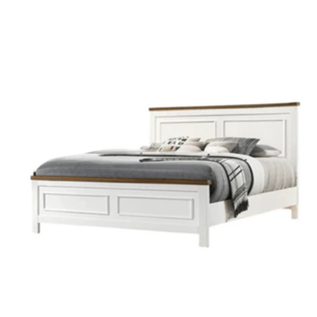 Çerçeveli paneller ve beyaz kaplama bu yatağa yeni bir görünüm kazandırıyor. Başlık ve ayaklıkların üst kısmındaki kahverengi ahşap vurgular, görünümü şık bir şekilde tamamlıyor.