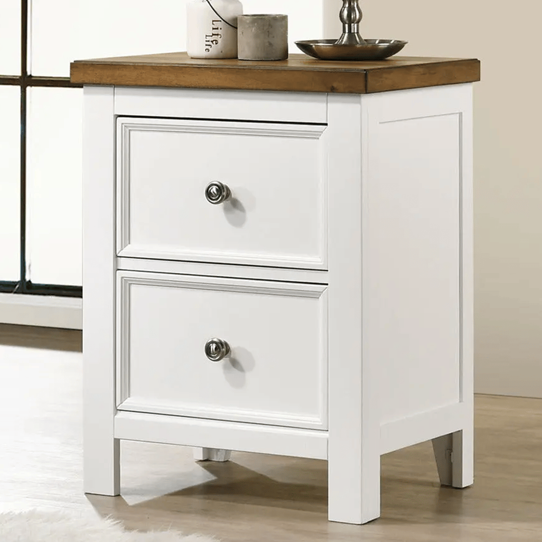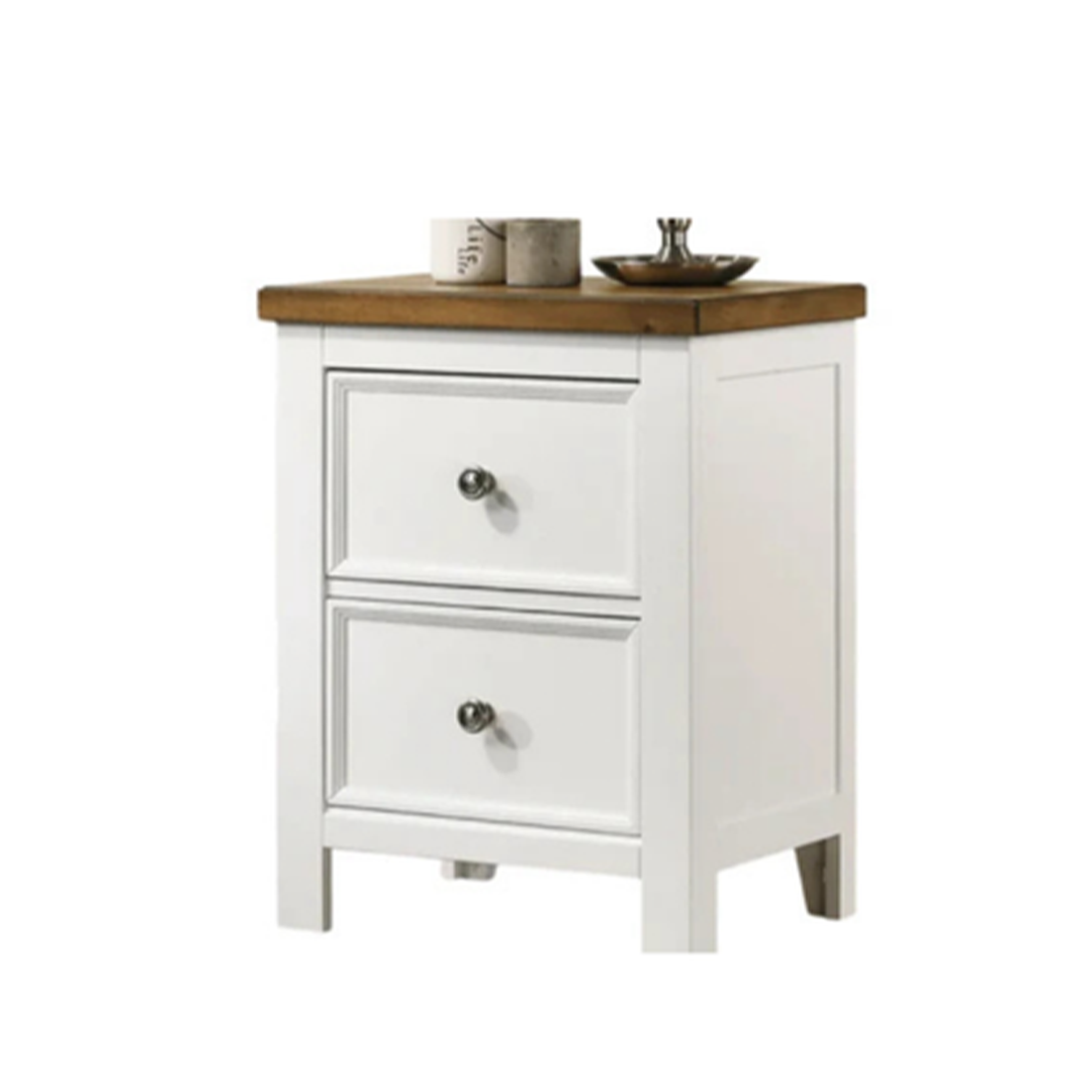 Temiz beyaz kaplaması ve ahşap renkli tablasıyla bu rustik komodin, yatak odanız için mükemmel bir tamamlayıcıdır. Depolama için iki çekmece, yatağı daha kullanışlı hale getirir.